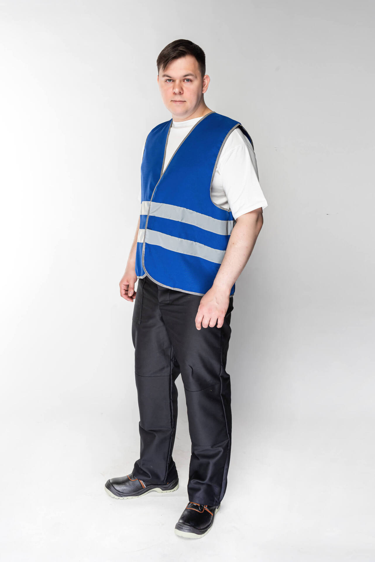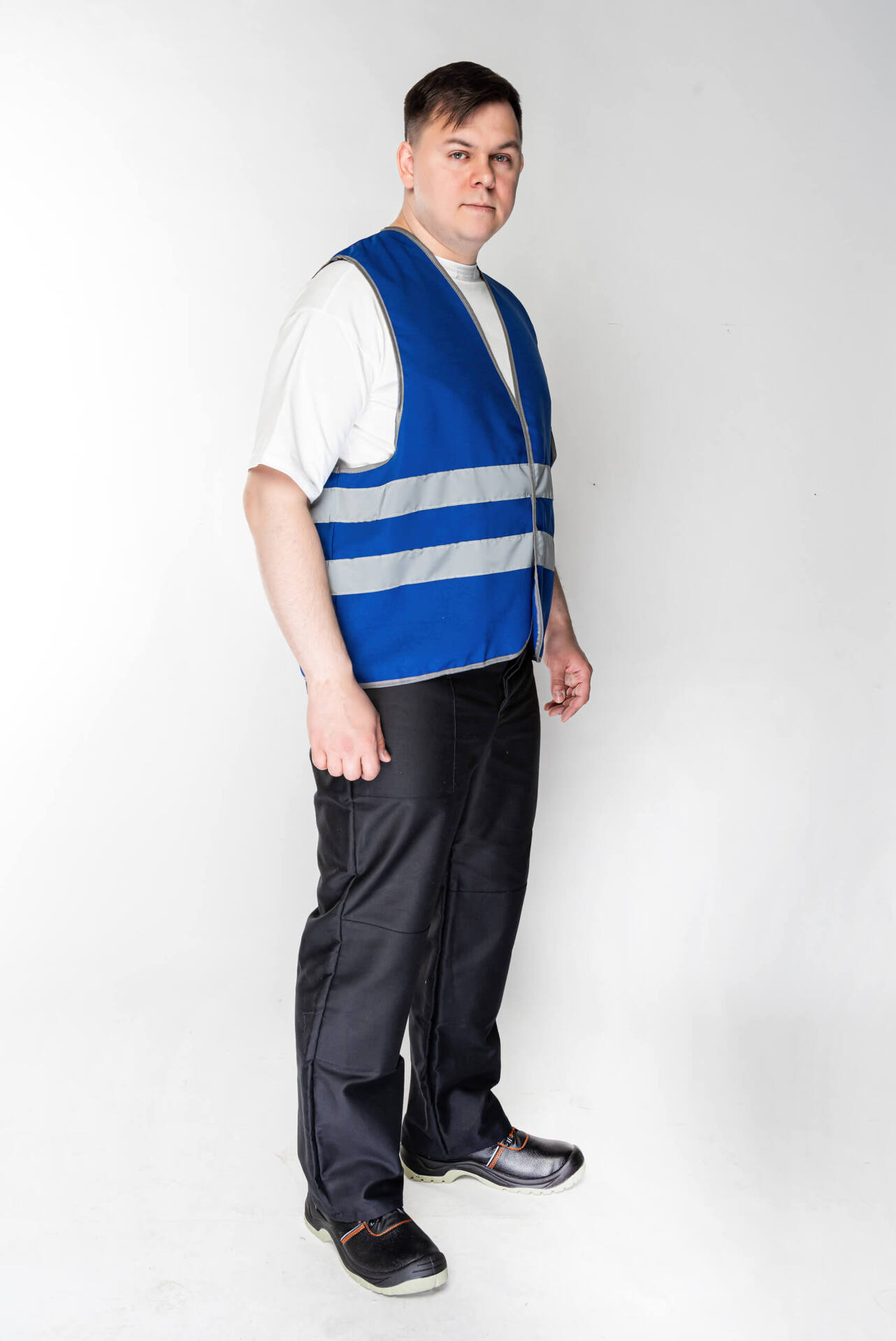 Светоотражающий синий жилет 1 класс защиты, обладающий повышенной видимостью